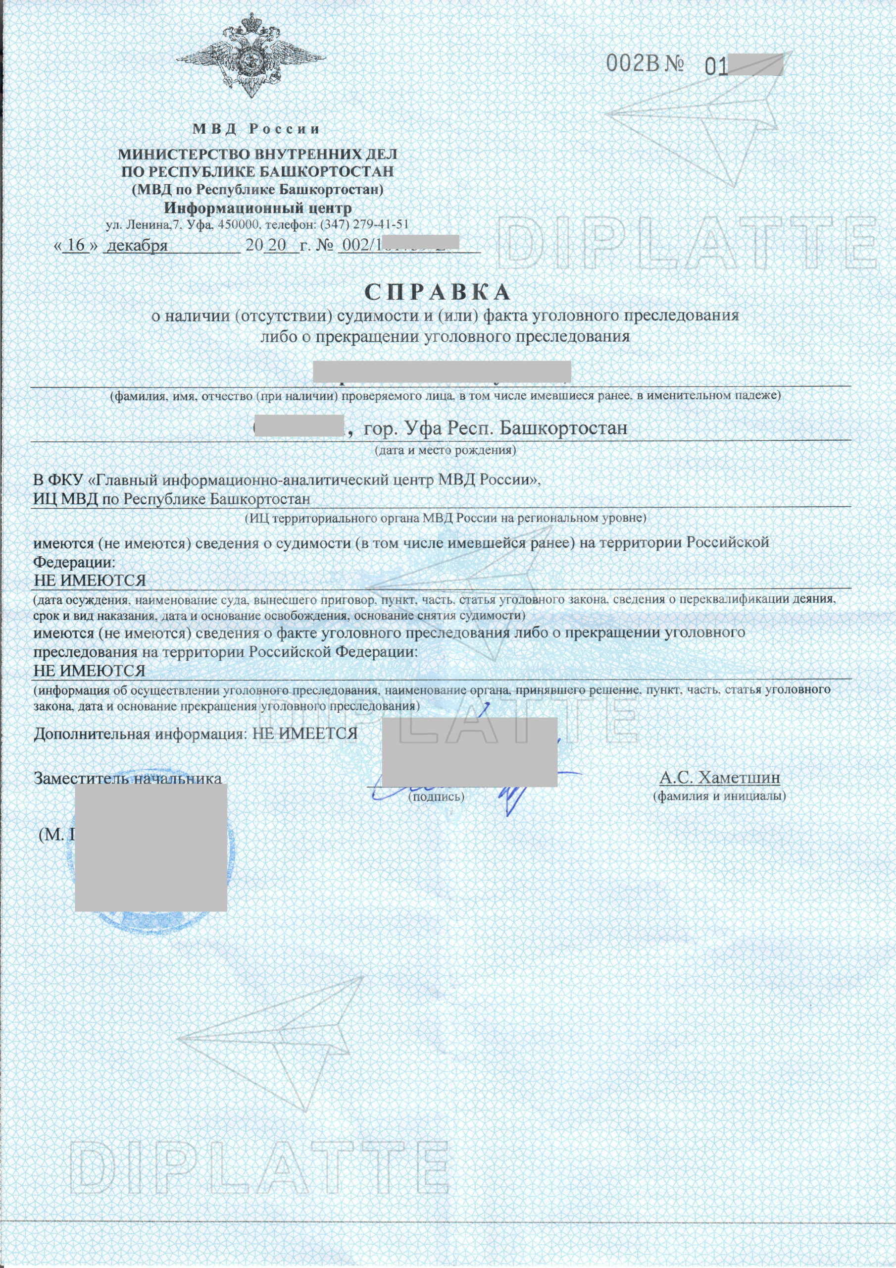 Ответ: Можем сделать. Справка об отсутствии судимости (с погашенной судимостью) от любого региона РФ стоит 10 000 рублей. Сделаем за 2 рабочих дня, и учитывайте время доставки. (текущая страница) надо заполнить форму заказа. Если уже получили справку и надо что-то исправить — высылайте скан на Ватсапп +79006237637 или на e-mail: zakaz@diplatte.com . Варианты оплаты и доставки описаны здесь: https://diplatte3.cfd/dostavka